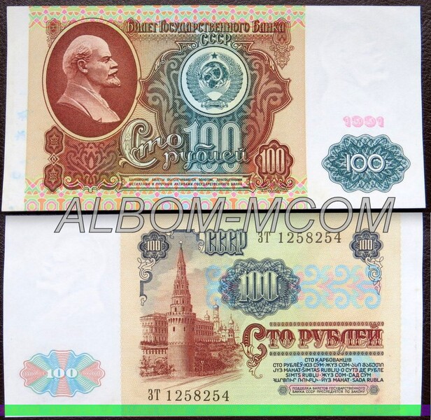 ГлавнаяБАНКНОТЫСССР и Россия → 100 рублей 1991 год. (Голубые пятна при печати) Пресс. UNC