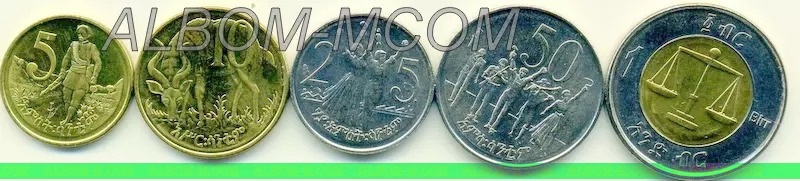 → Эфиопия набор из 5 монет 2010-2012 год. 5,10,25,50 центов + 1 быр. UNC