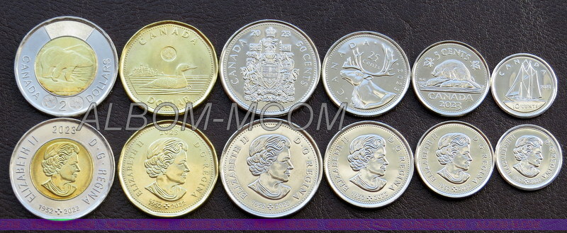 → Канада 2023 год. Набор 6 монет. 5, 10, 25, 50 центов, 1, 2 доллара. Королева Елизавета II. UNC