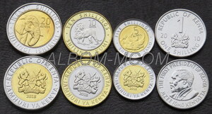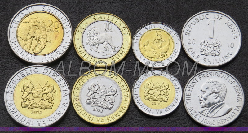 → Кения набор монет 1, 5,10 и 20 шиллингов 2010-18 год. Африканские животные Лев, Слон, Носорог. UNC