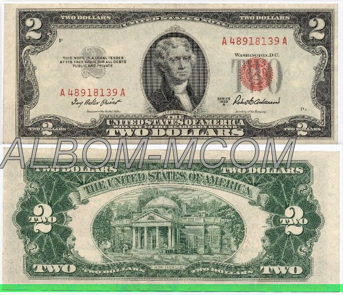 → США 2 доллара 1953 год. Президент Джефферсон. Красная печать. Серия А. Пресс. AUNC