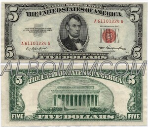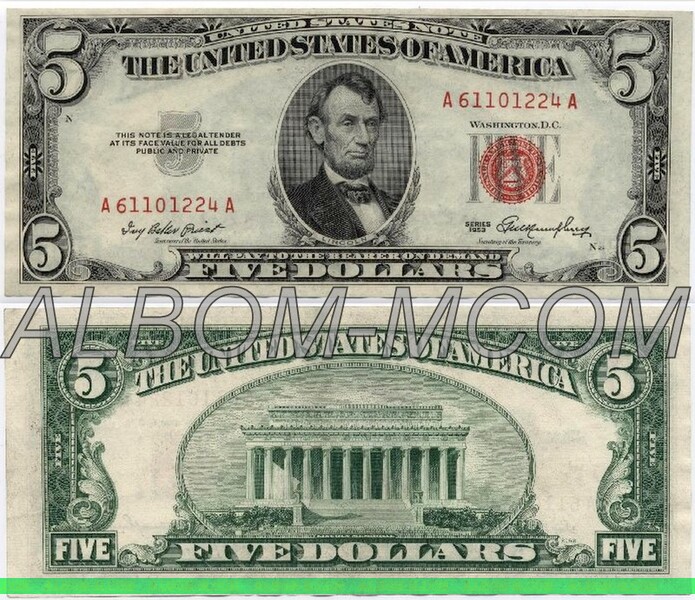 → США 5 долларов 1953 год. Президент А. Линкольн. Серия А. Красная печать. Пресс. AUNC