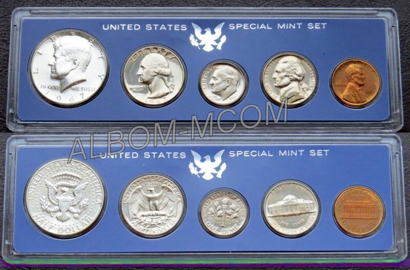 → США Годовой набор 1967 год из 5 монет: 1, 5, 10(дайм) 25 и 50 центов (Кеннеди-Серебро). Special Mint Set. Пруф-лайк.